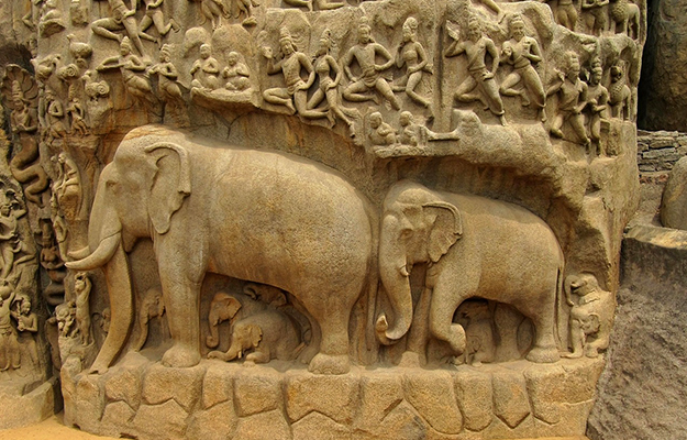 - Arjuna's Penance or Descent of the Ganges - it is a giant open-air rock relief carved on two rock. The legend depicted descent of the river Ganges to earth from the heavens led by Bhagiratha. , and also wild and domestic animals, all admiringly looking up at the scene.